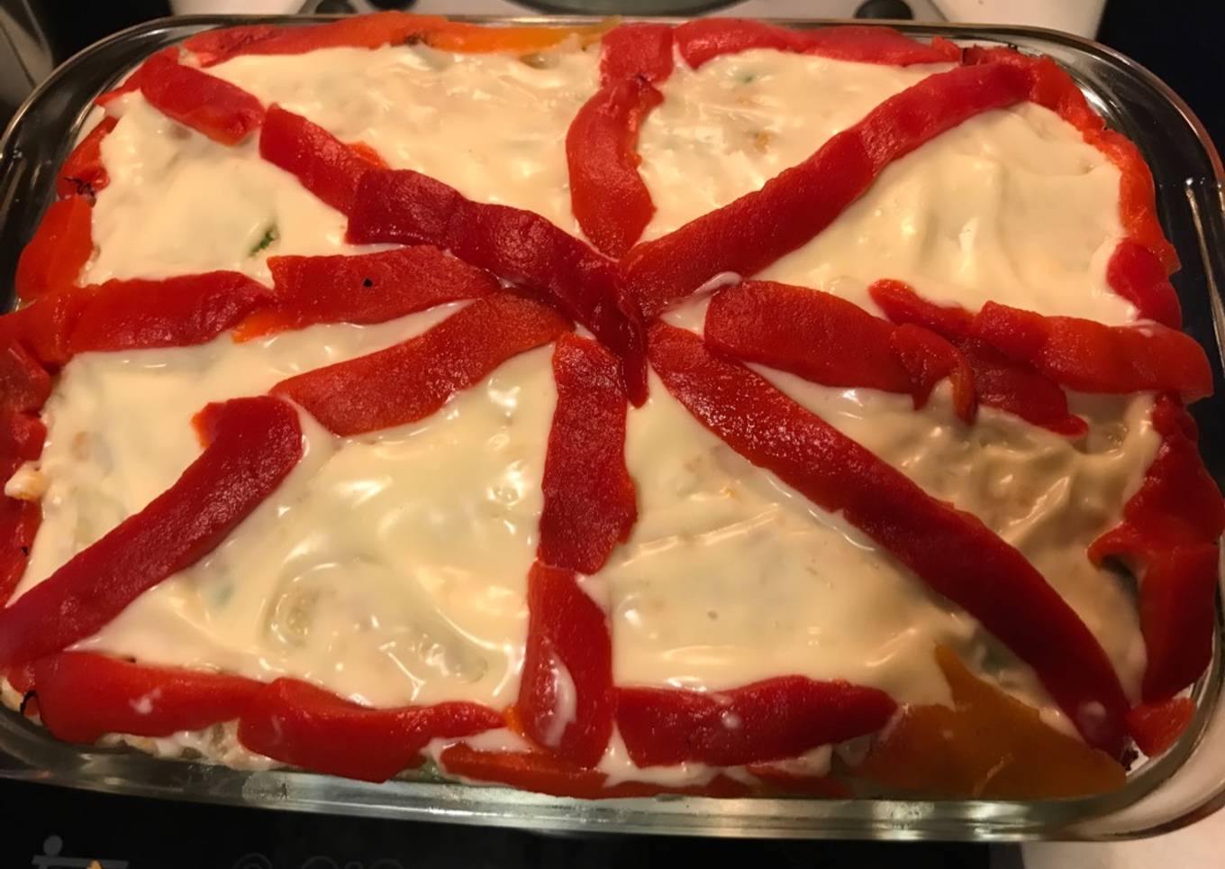 - Decorar al gusto (yo esta vez le he puesto una capa de mayonesa y tiras de pimiento rojo asado), meter en el frigo para que esté bien fresquita, y a disfrutarla.