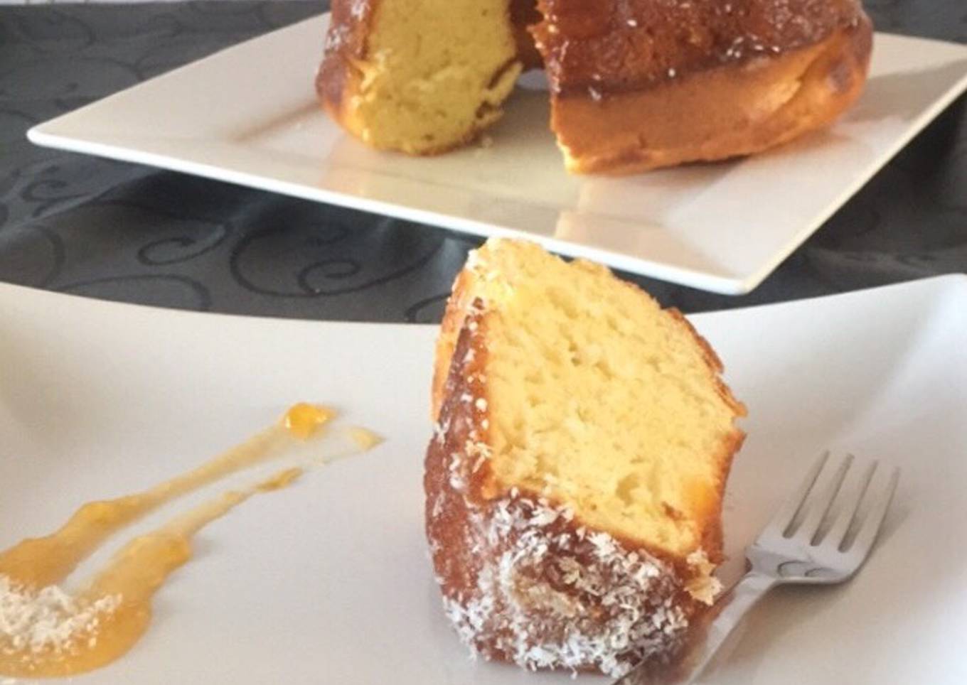 - Introducir al horno a 180 ºC durante 30-35min. Y listo. Una vez horneado le he puesto mermelada de melocotón y coco rallado por encima.
